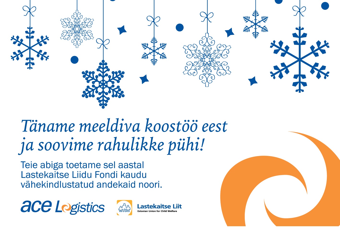 ACE Logistics otsustas sel aastal jõulukinkide asemel toetada läbi Lastekaitse Liidu Fondi andekaid noori. Sihtasutuse Eesti Rahvuskultuuri Fond allfondina tegutsev Lastekaitse Liidu Fond on asutatud 2002. aastal eesmärgiga toetada põhi- või keskharidust omandavaid andekaid õpilasi ning laiendada nende võimalusi edasiarenemiseks. Meie eelistus langes eelkõige vähekindlustatud andekatele noortele.