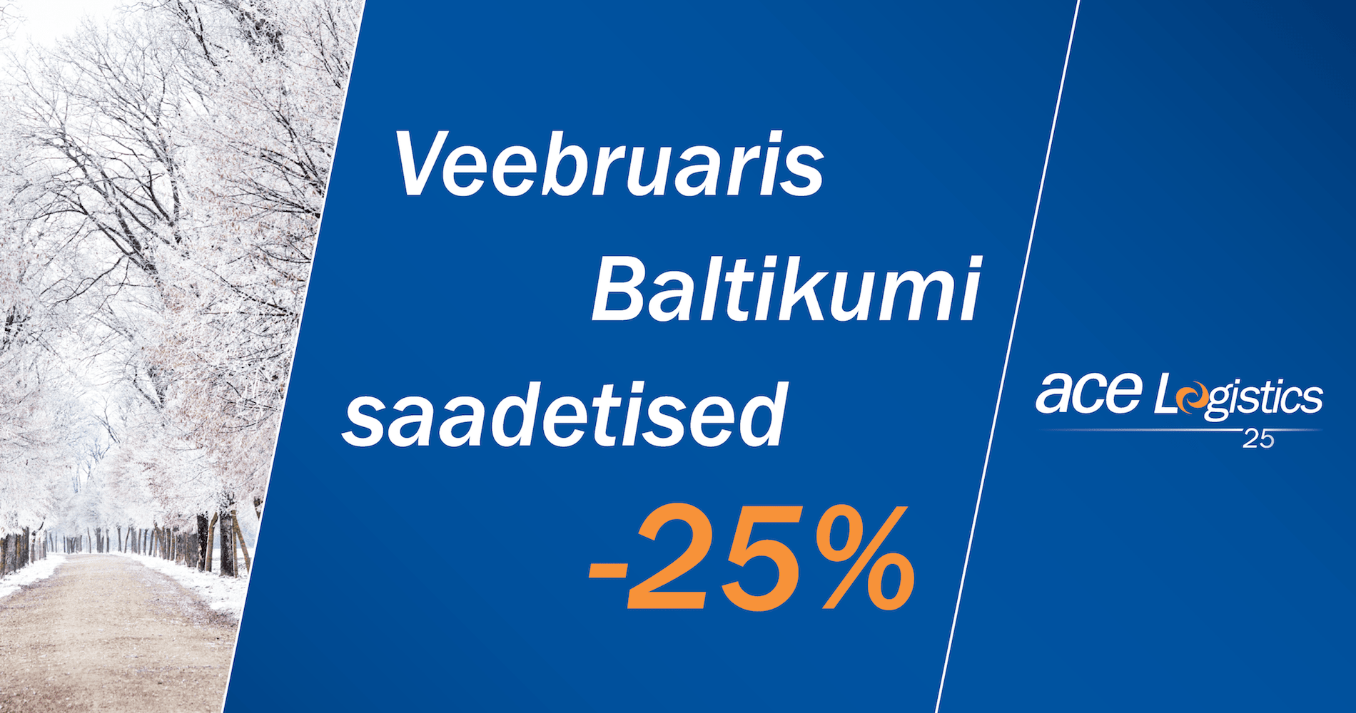 ACE Logistics Estonial täitub käesoleval aastal 25. Tegevusaasta ja tulenevalt Baltikumi suunalise veovõimsuse suurendamisest pakume veebruarikuus kõigile Baltikumi suunalistele saadetistele -25% soodustust. Soodustuse saamiseks tuleb tellimus teha läbi e-ace keskkonna märkides „Special agreement“ lahtrisse „ACE25“