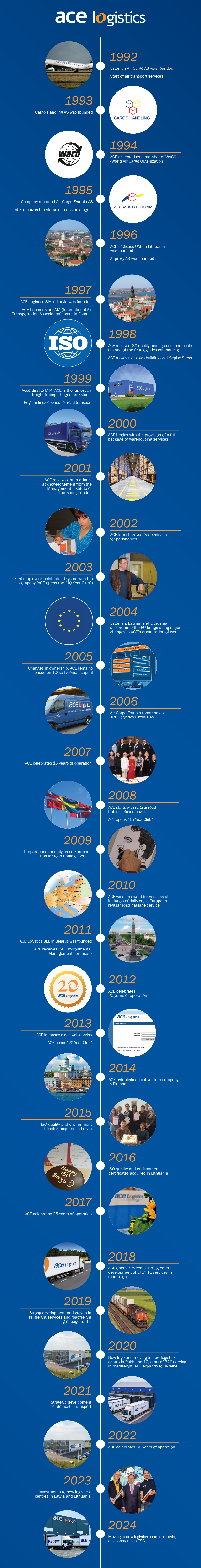 Established in 1992, ACE Logistics aims to be one of the leading logistics service providers in the Baltics region, combining persistent and long-term satisfaction of its customers, employees and shareholders with more than 30 years of experience in the logistics sector.